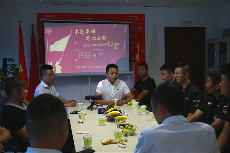 7月31日,“八·一建军节”即将来临之际,四川中安卫保安服务有限公司特别邀请了在公司任职的退伍军人到公司相聚一堂,以座谈会的形式与各项目退伍军人代表进行了深入的交谈。